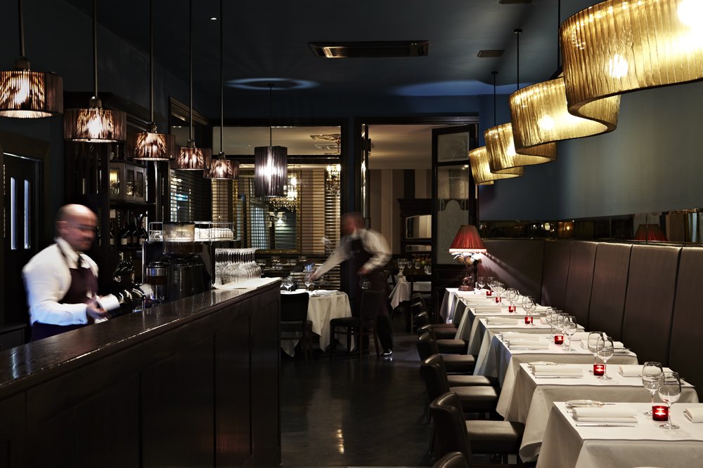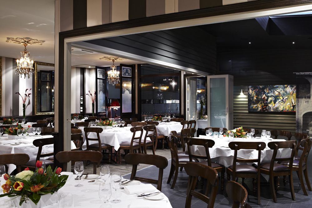 A non-private area of style and sophistication with comfortable banquette seating and the ambience of our original antique French bar fittings.